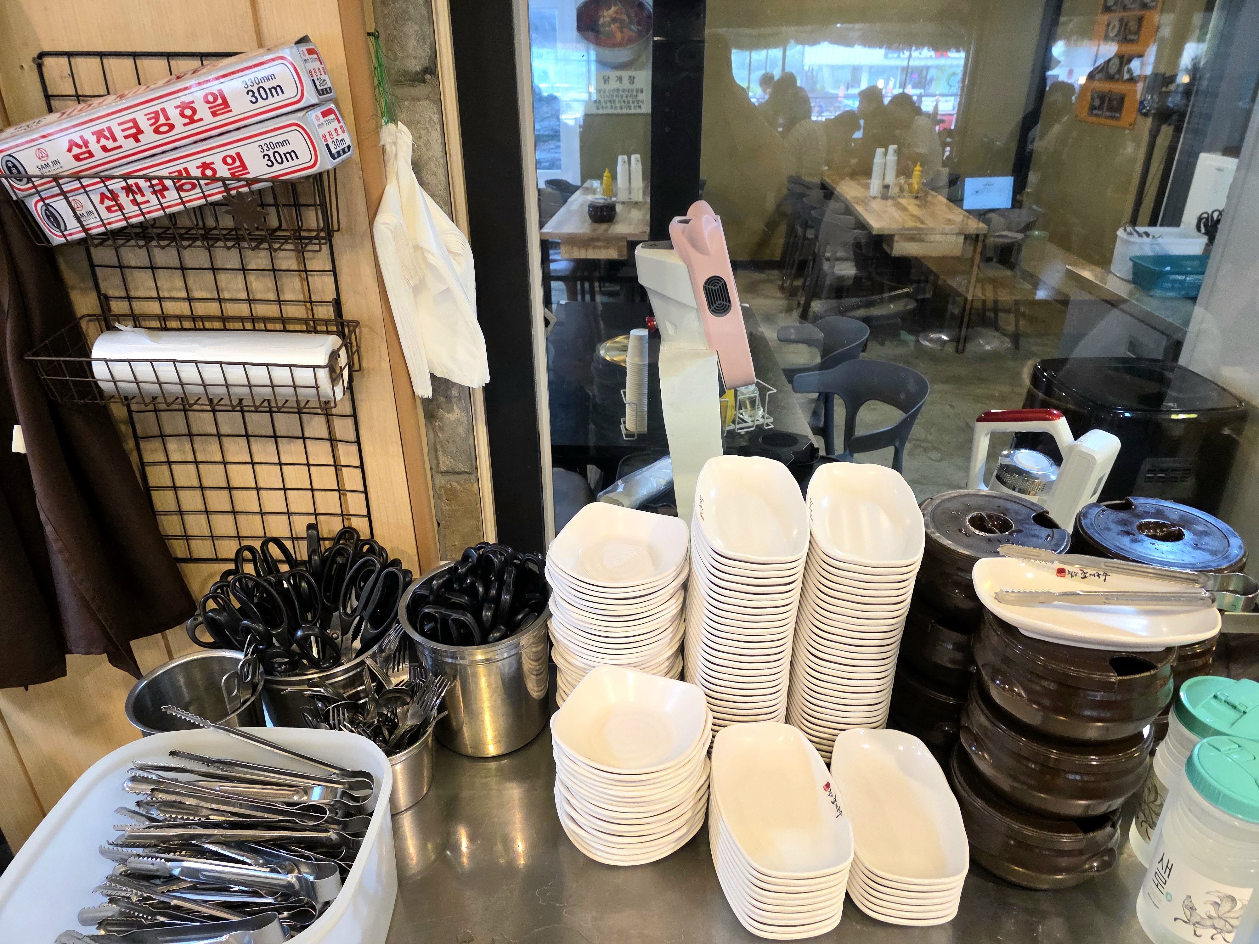 셀프바에는 집게, 가위, 앞접시, 김치, 물 등