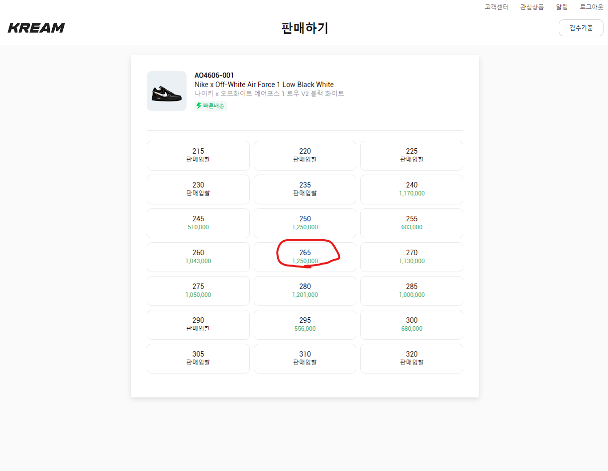 사이즈 하단에 가격이 있으면 바로 판매가 가능하고