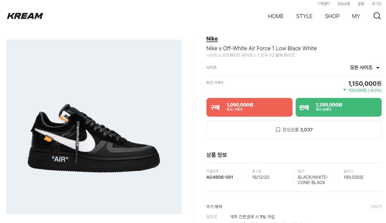 일단 크림에 접속해 신발을 찾아 상세화면으로 들어간다