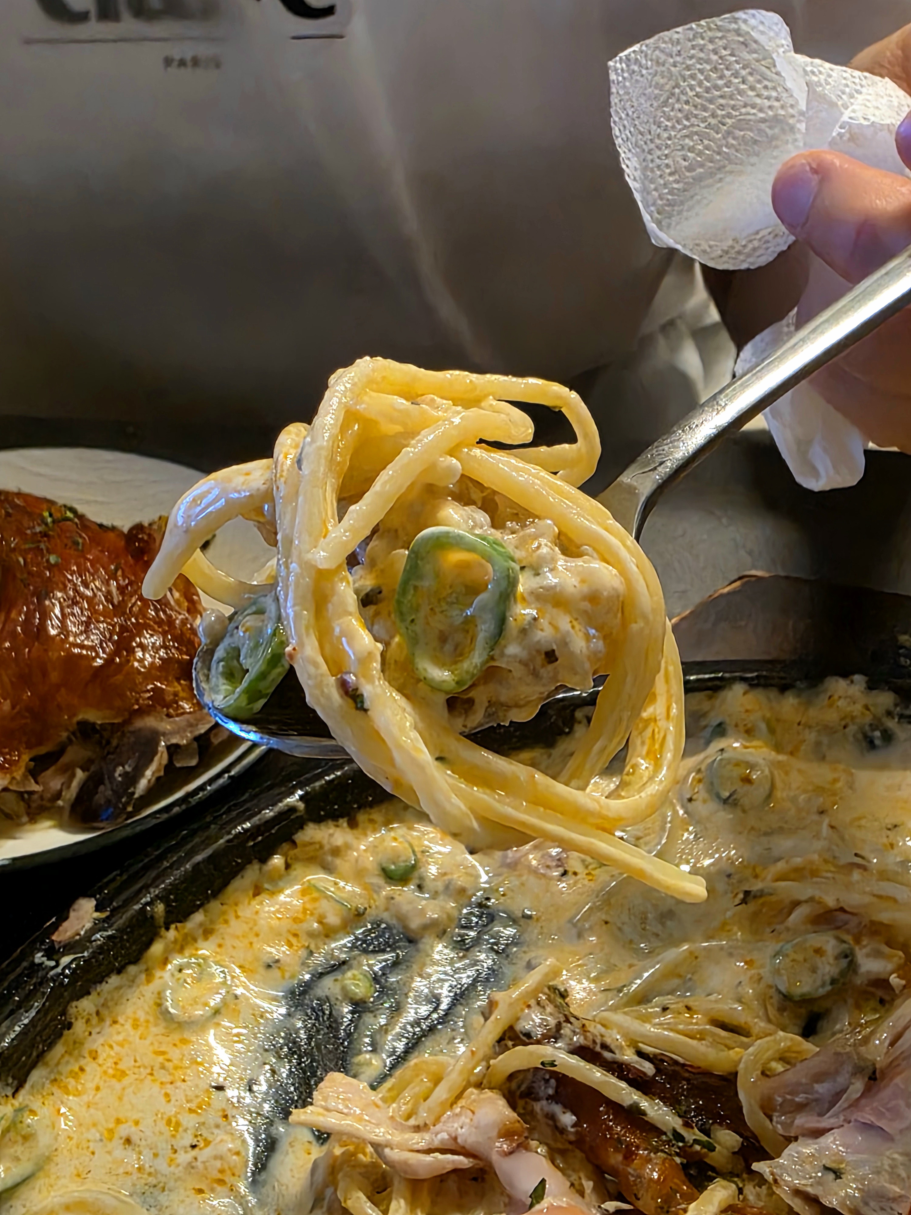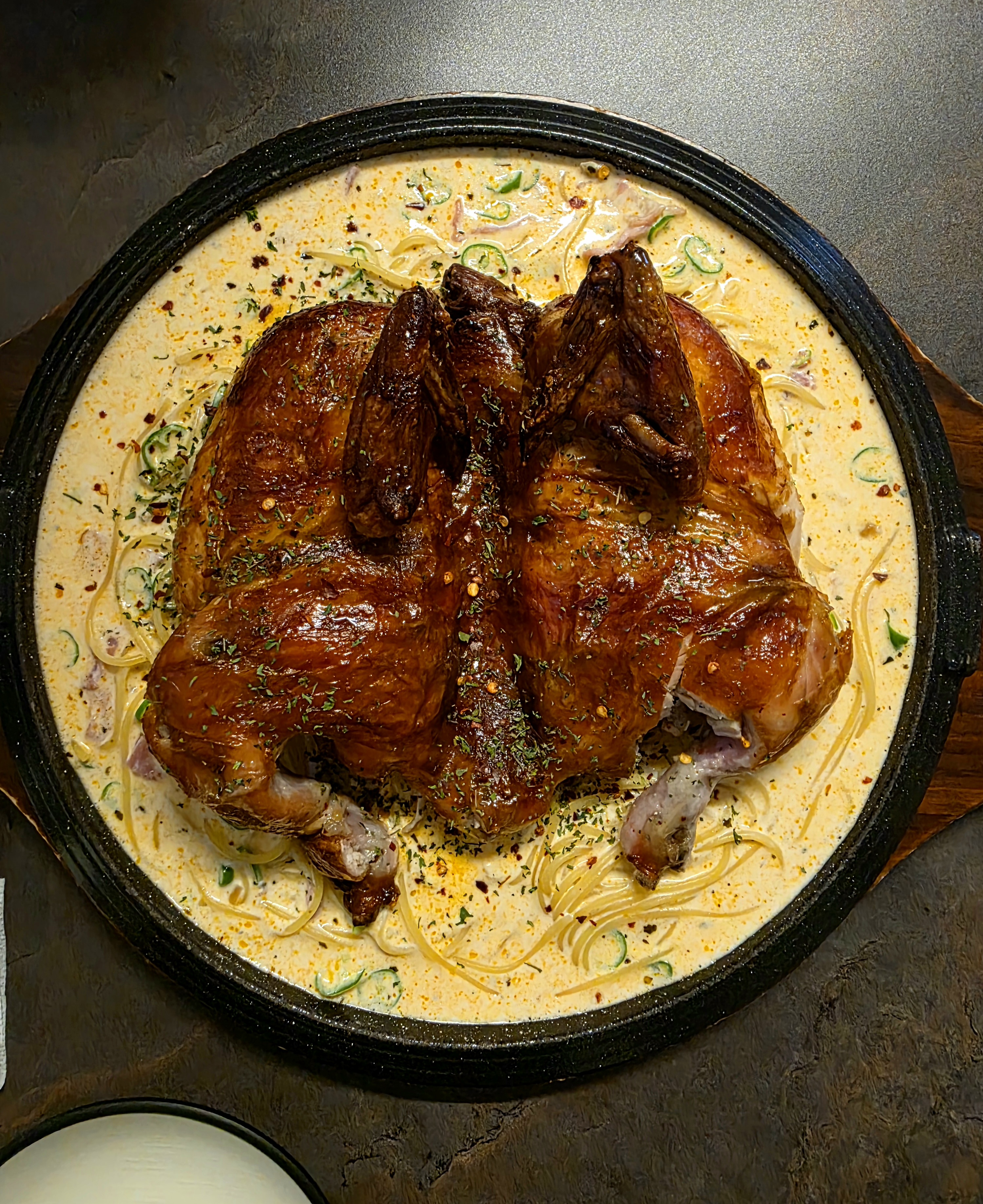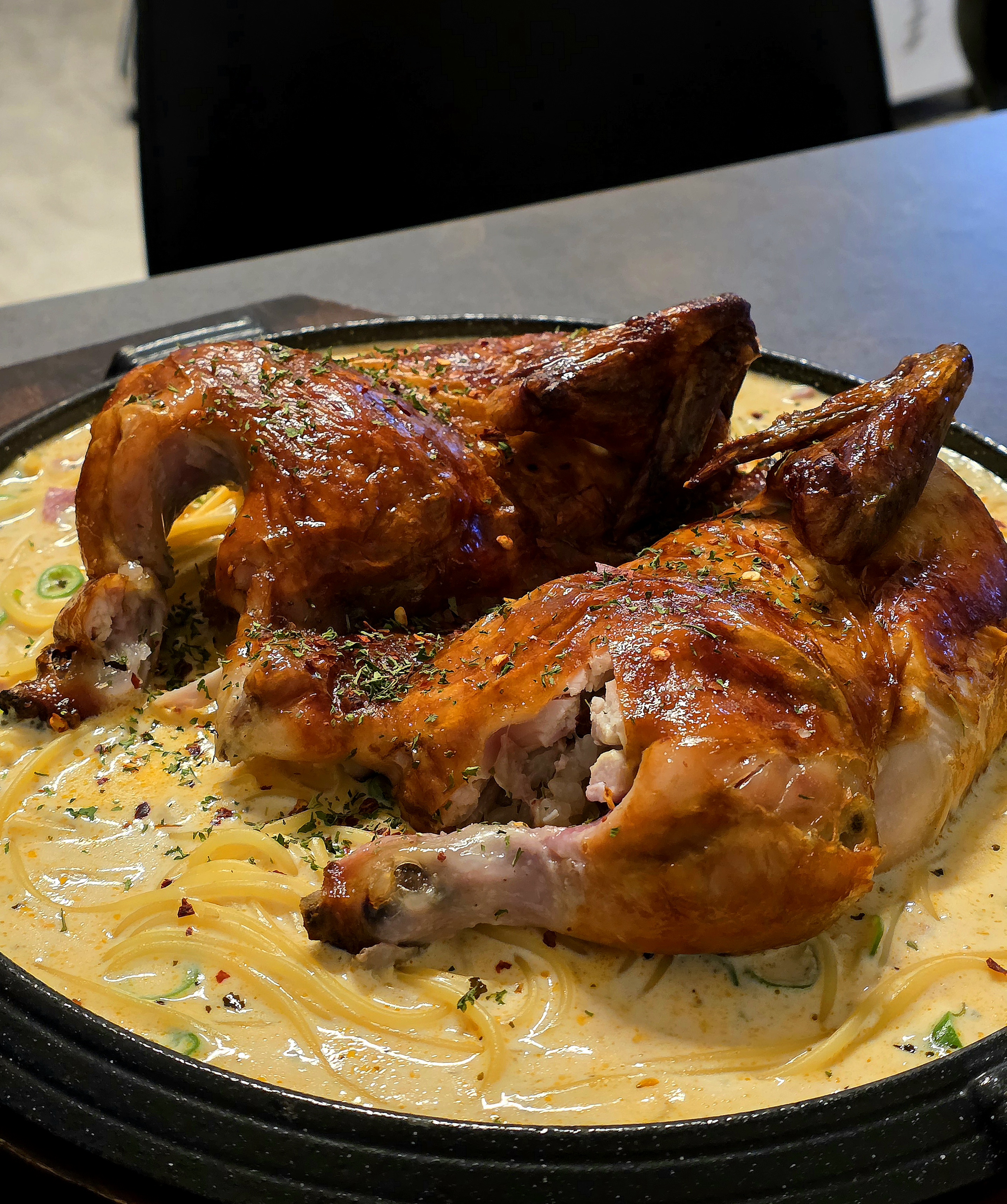 통닭 밑에는 청양크림 파스타가 깔려있어요