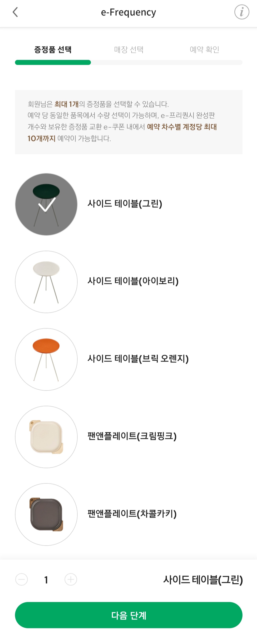 프리퀀시 화면 하단에 '증정품 예약하기'를 누르면 위 화면으로 갈 수 있습니다