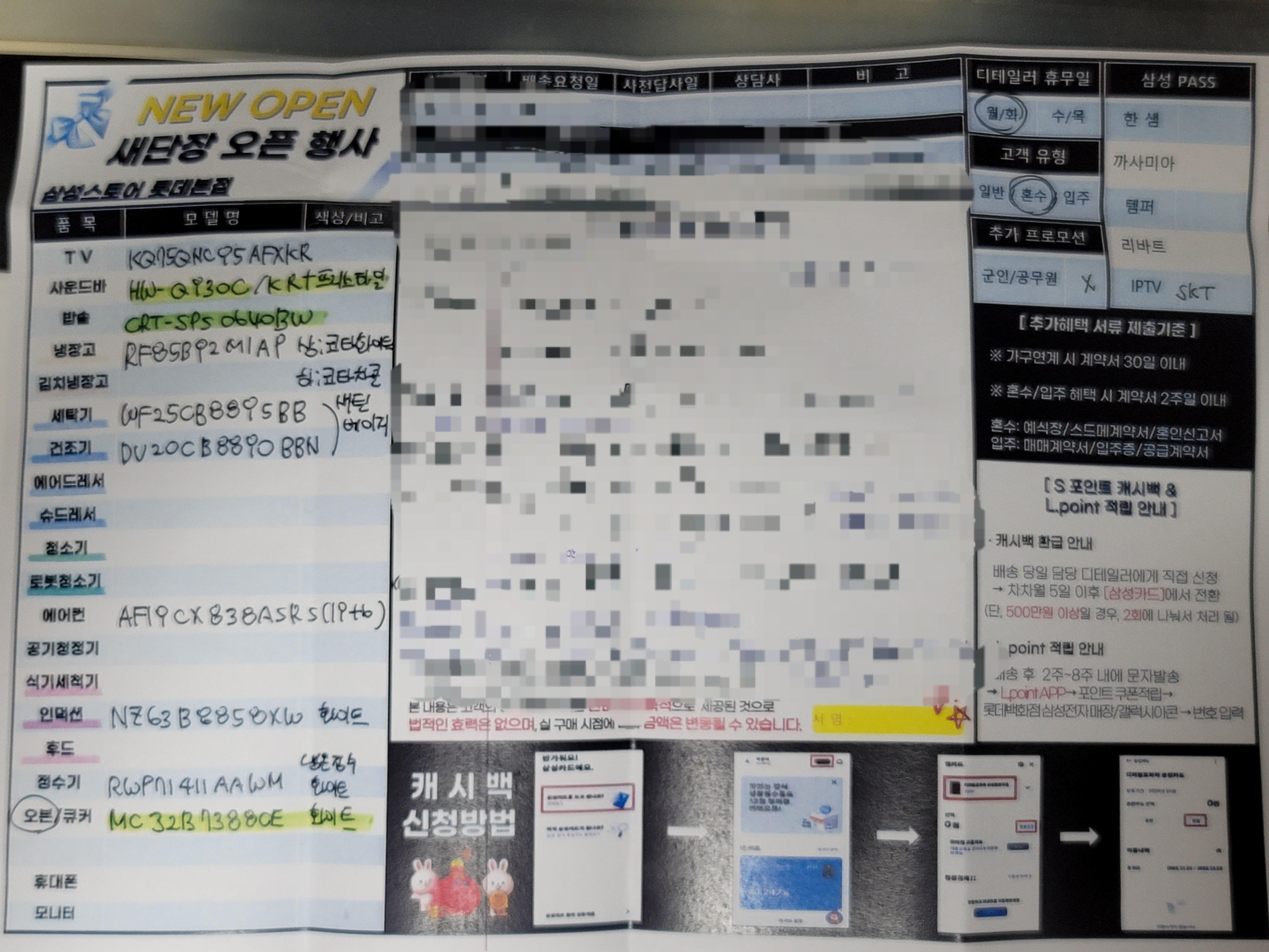 그래서 최종으론 TV, 냉장고, 세탁기, 건조기, 에어컨, 인덕션, 정수기를 구매하게 되었고