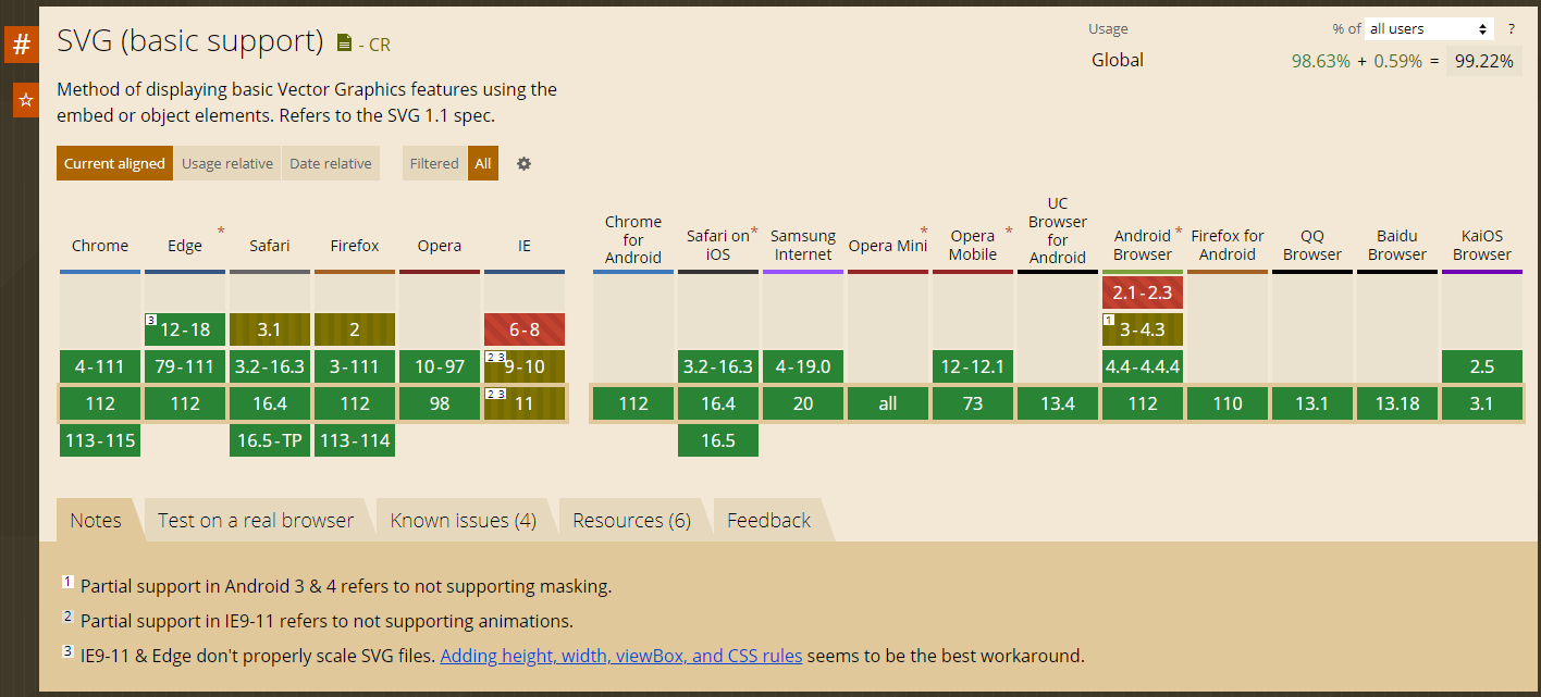SVG는 파이어폭스, 오페라, 웹킷 브라우저, 인터넷 익스플로러 및 기타 여러 브라우저에서 부분적으로 지원하고 있다