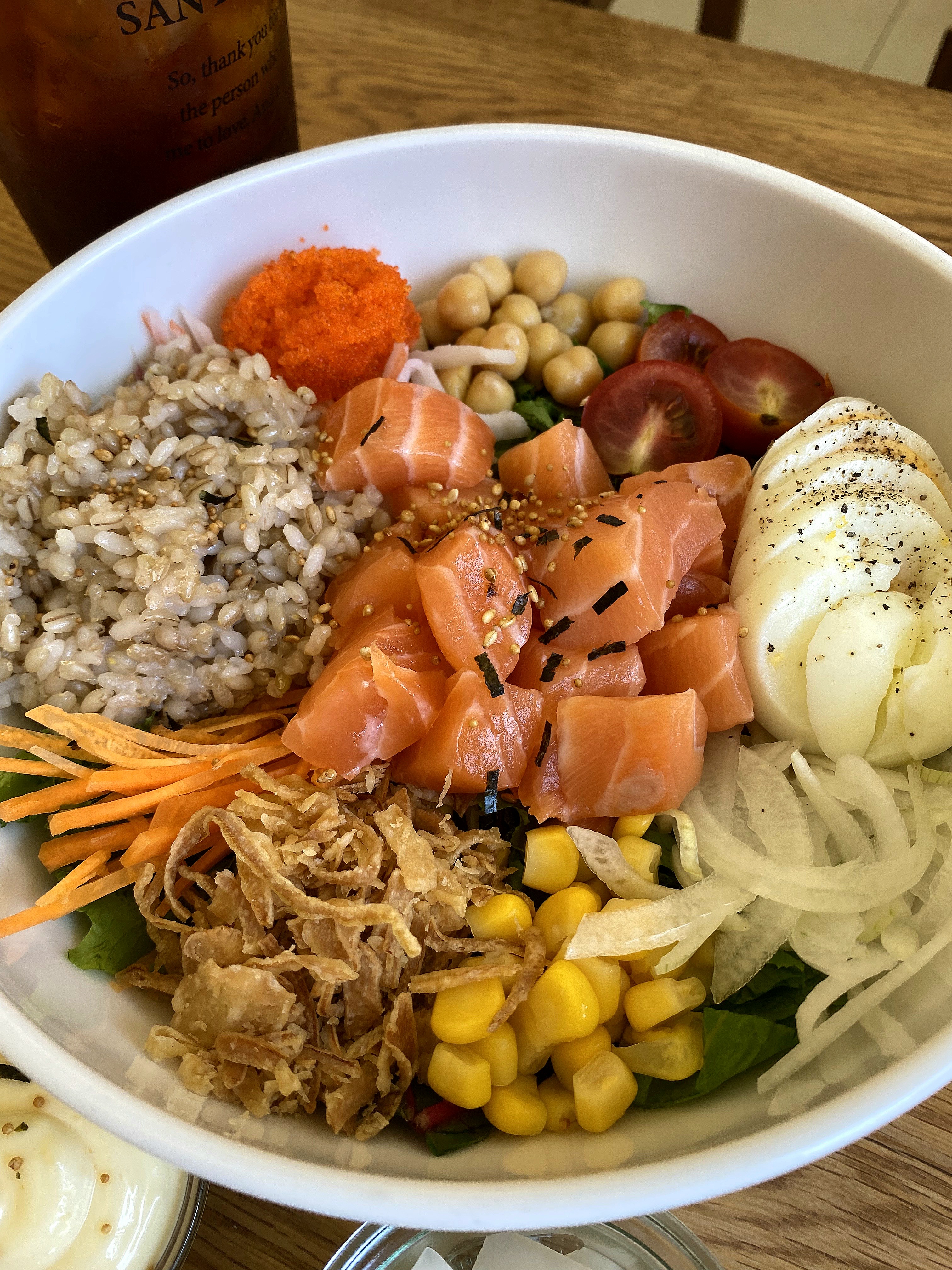 신선한 연어가 보리밥과 샐러드와 함께 어우러져 있었습니다
